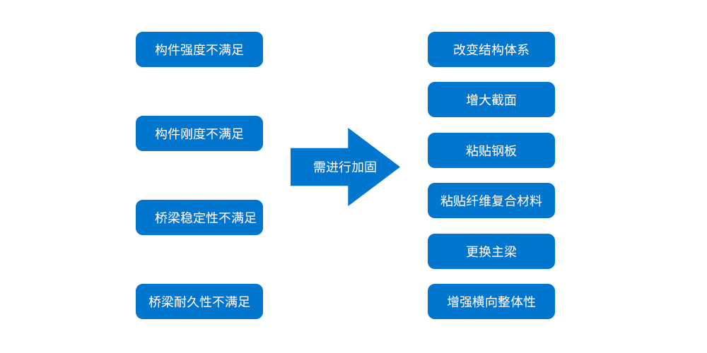 外套鋼管混凝土增大截面、粘貼纖維復合材料、更換吊桿或系桿、改善橋面系結構及增強橫向整體性 |